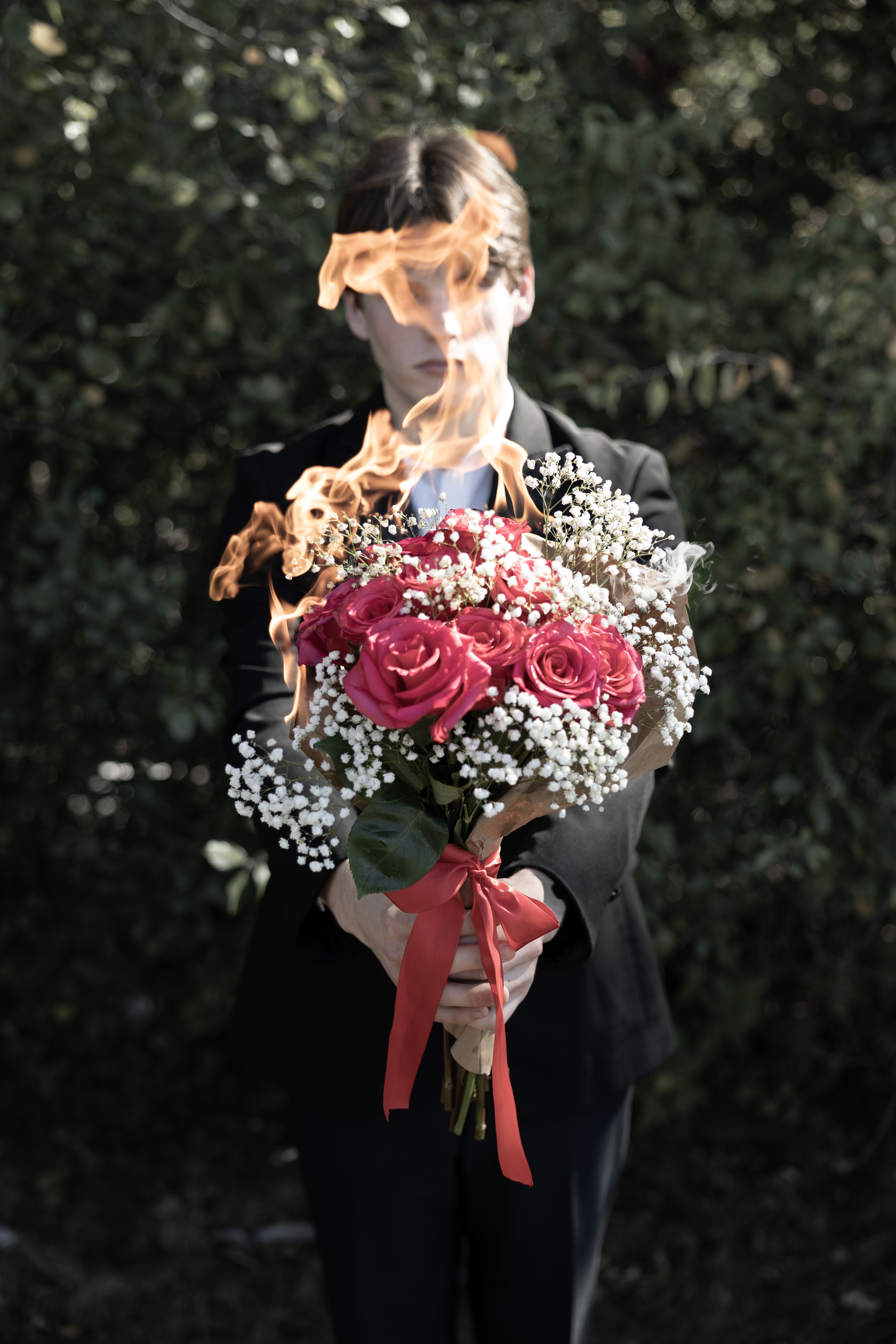 This piece is about the quiet heartbreak of giving everything you have your love, your time, your sincerity and still watching it all fall apart. It captures that feeling of holding something beautiful and fragile, knowing it won’t last, but offering it anyway because you still believe in its meaning. The burning bouquet represents what it feels like to care deeply in a world that keeps disappointing you to love, to hope, to try, even when everything around you seems to crumble. It’s the emotional exhaustion that comes from constantly pouring yourself into people, plans, and dreams that never quite work out the way you hoped. The fire is both destruction and truth. It shows how quickly things we build can fall apart, how easily warmth can turn into pain. But it also exposes something real: the honesty that comes with losing illusions. Sometimes, when everything we thought was stable starts to burn, we finally see what truly matters. There’s a painful beauty in that moment of loss, a strange peace in accepting that not everything can be saved. This photograph isn’t just about sadness, it's about resilience. It’s about continuing to hold on, even as the flames rise higher. It reflects the emotional landscape of growing up in uncertain times, when hope feels fragile but necessary. It’s about learning that destruction doesn’t always mean the end; sometimes, it’s a painful kind of beginning. Through the smoke and the ashes, there’s still a heartbeat a reminder that even when love burns, it leaves behind the strength to start again.