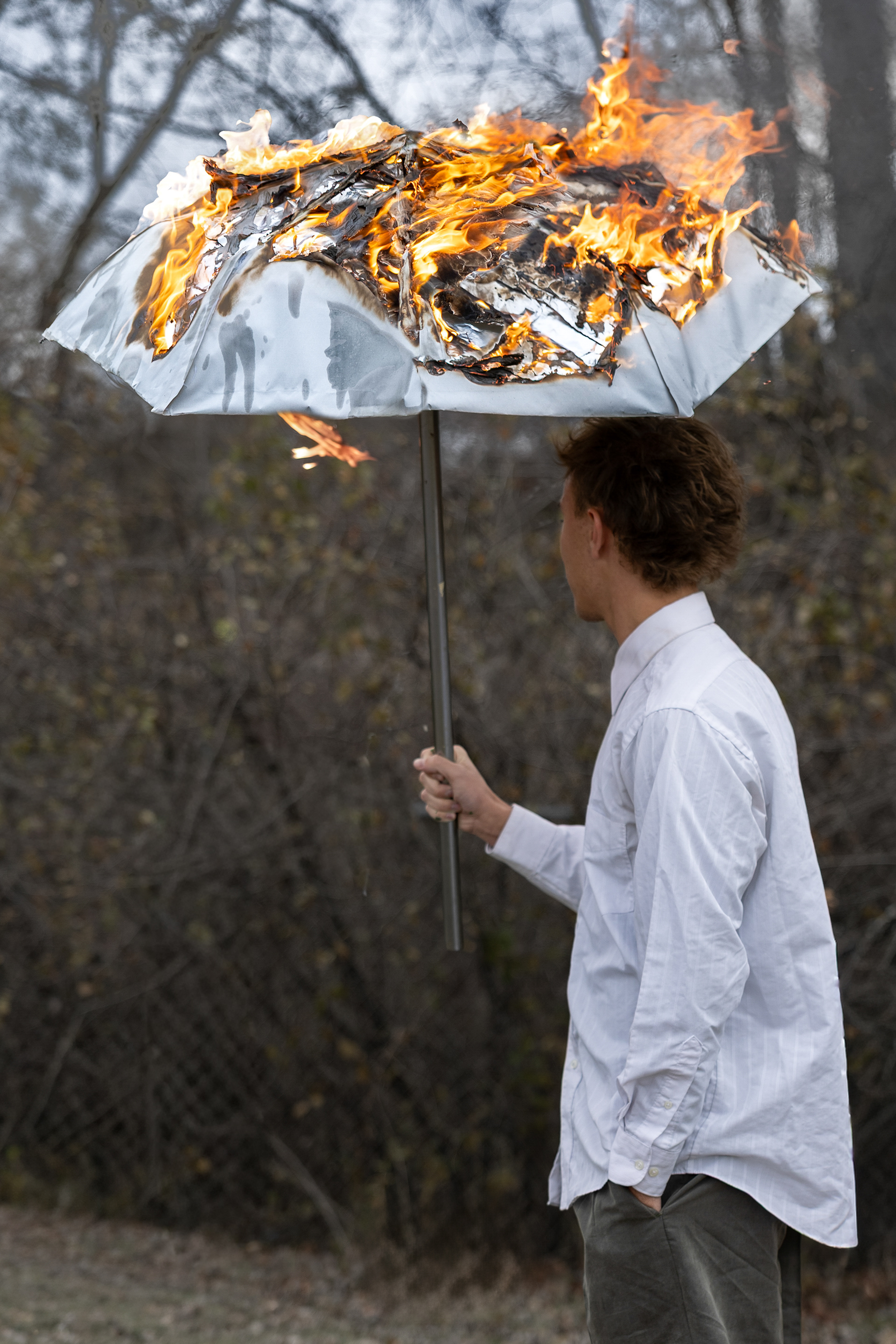 This image captures the strange, fragile tension of holding onto something that’s supposed to protect you even as it collapses in real time. The burning umbrella becomes the centerpiece of that feeling, a symbol of safety turning into danger, comfort flickering into chaos. Umbrellas are meant to shield us from storms, but here the storm is coming from above, from the very thing designed to keep the world out. The flames represent emotional overload, the piling weight of expectations, stress, and uncertainty that so many people quietly carry. It’s the moment when the tools you’ve been taught to trust coping mechanisms, reassurance, the belief that staying calm will be enough begin to fail under the pressure, burning at the edges until there’s nothing left to hold together. And yet, the figure doesn’t run. He doesn’t drop the umbrella or turn away from the heat. Instead, he stands still, grounded, one hand in his pocket, looking almost contemplative. That stillness becomes its own kind of power. It reflects the resilience of someone who has learned to navigate chaos not by escaping it, but by enduring it. It’s the quiet realization that sometimes you cling to familiar things, even when they’re hurting you, simply because letting go feels more terrifying than staying put. But beneath the destruction is clarity. A burning object can illuminate the truth better than an intact one. The fire exposes the emptiness inside the umbrella, the fragility of its structure, the illusion of its promise. And in that exposure lies a deeper meaning: the moment you finally see that what you’ve been depending on isn’t strong enough to protect you is also the moment you become strong enough to step out from beneath it. This photograph isn’t just about collapse, it's about awakening, resilience, and the quiet courage of facing the world even when your shelter is on fire.