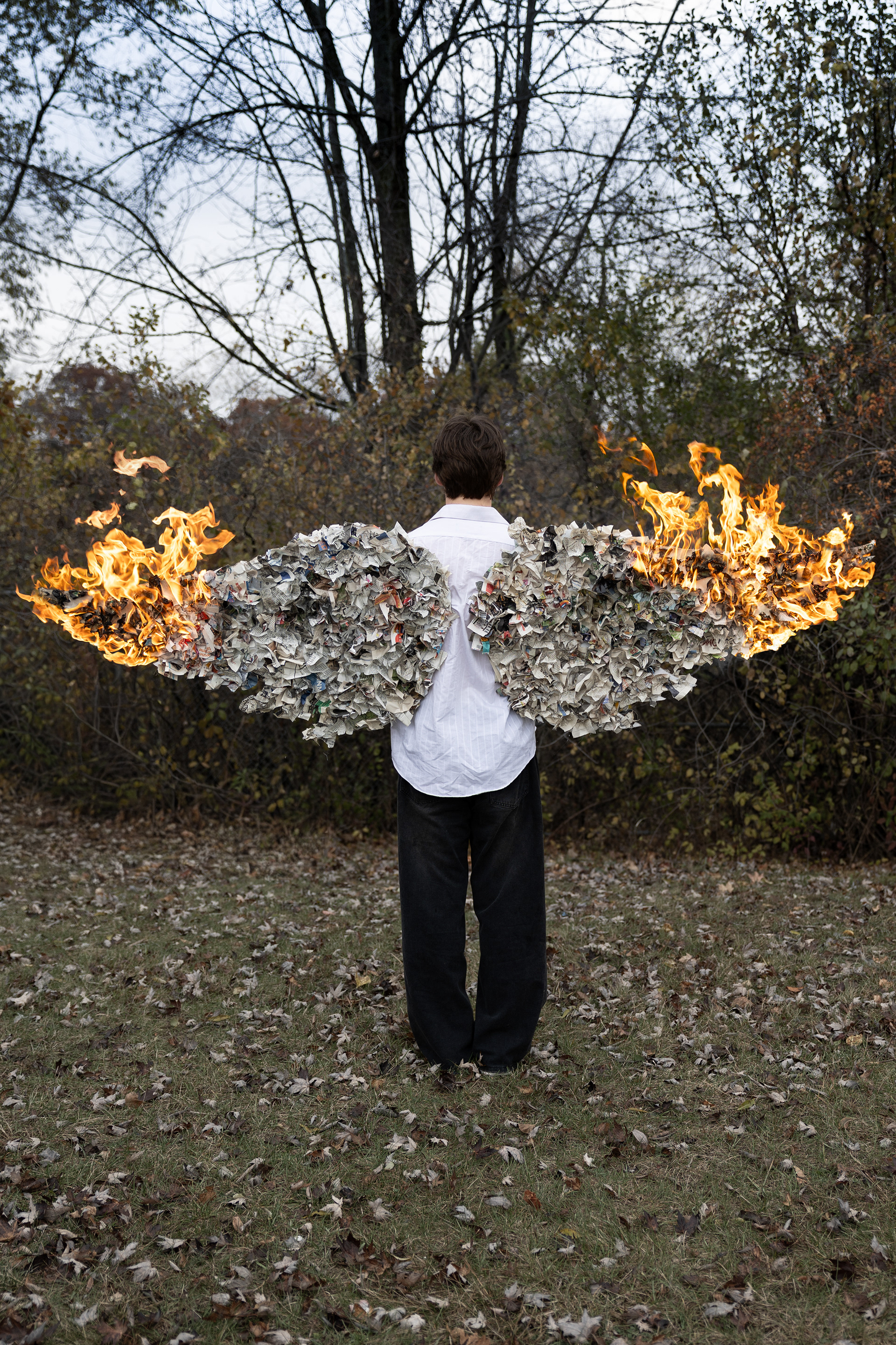 This piece captures what it feels like to grow up in a world where every headline becomes a weight on your shoulders. The wings, made entirely of newspapers, symbolize the constant stream of global problems teens are exposed to: conflict, climate disasters, political chaos, violence, and uncertainty are all the things the world expects young people to understand, process, and somehow rise above. But in the image, those wings are burning. The flames represent the emotional overload that comes from carrying so much information without having the power to change it, the way today’s teens absorb crisis after crisis until it all becomes too heavy to hold. As the paper wings fall apart, they reflect how overwhelming and exhausting it is to grow up in a generation that is always plugged in, always aware, always expected to care. Yet the figure stands still, not running from the fire, showing the quiet resilience of young people who continue moving forward even while the world seems to crumble around them. The burning wings reveal both destruction and truth: they show how the pressure of global issues can feel unbearable, but also how these experiences shape teens into people who see the world clearly and refuse to look away. In the end, the image is about carrying the weight of a burning world and still choosing to stand, to endure, and to become something stronger in the process.